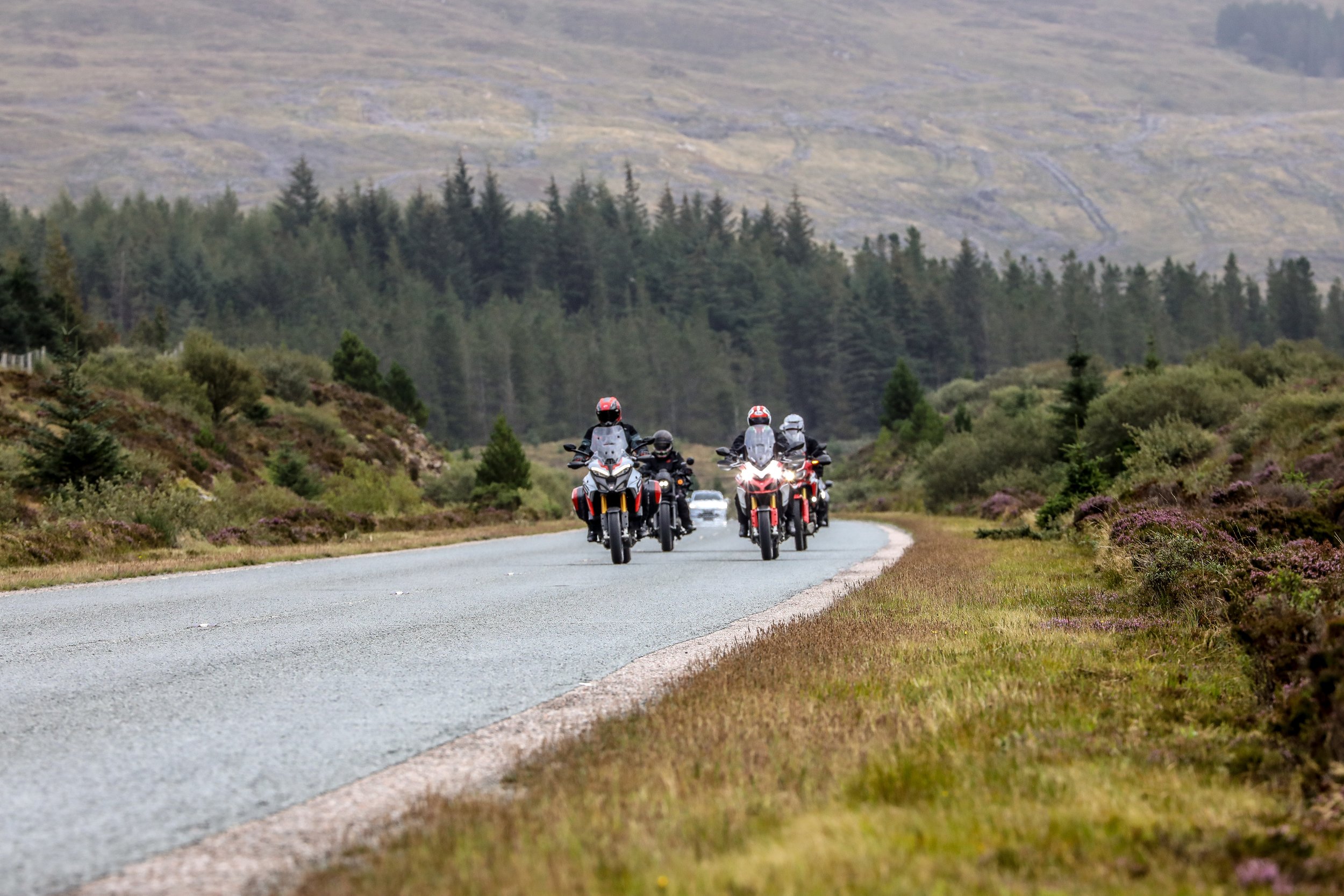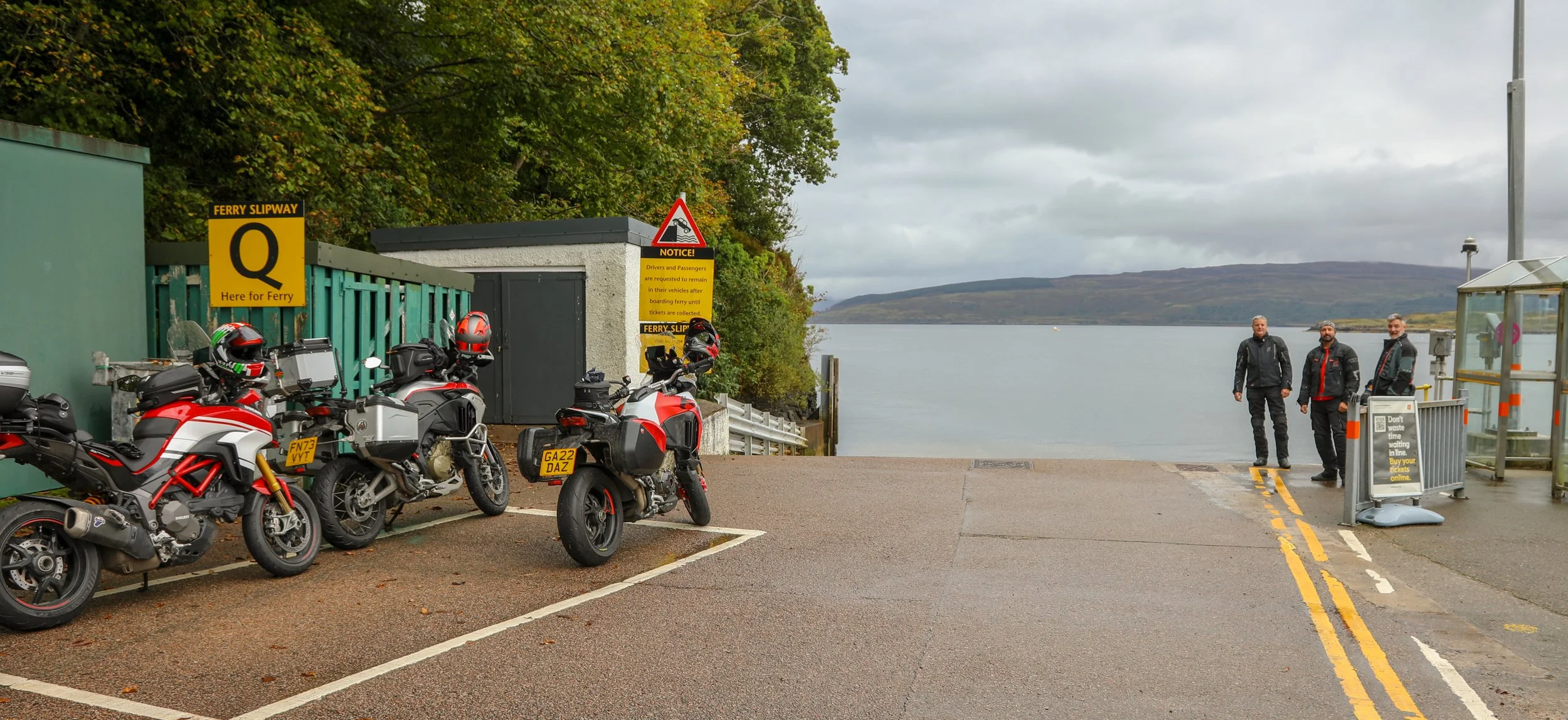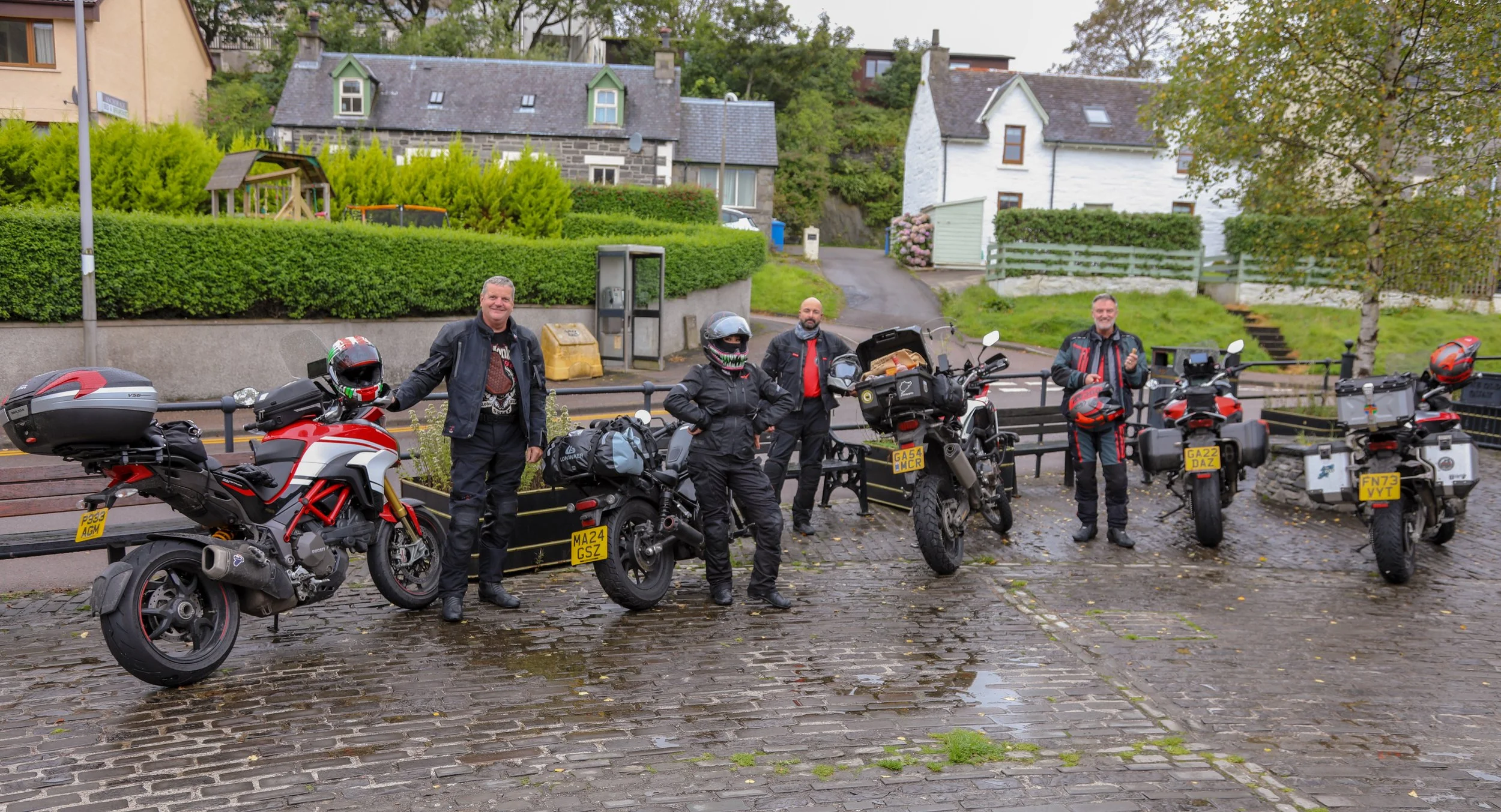 We roll out of Moffat and immediately find rhythm in the flowing curves of the Southern Uplands. It’s the perfect opener — open sight lines, smooth tarmac, and the kind of roads that let everyone settle into tour mode. As we push North, Scotland begins to stretch its legs. Valleys widen. Mountains sharpen. The Highlands rise. We carve through vast glens and dramatic ridgelines before reaching the west coast and boarding our first ferry — engines off, sea air on, anticipation building. Landing on the Isle of Mull shifts the tone instantly. Narrower roads, coastal bends, wild scenery and that unmistakable island calm. We finish in Tobermory, its colourful harbour providing a picture-perfect end to day one.
